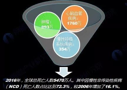 根據(jù)2016全球疾病負(fù)擔(dān)研究(Global Burdenof Disease Study 2016,GBD)公布的數(shù)據(jù)顯示,2016年全球總死亡人數(shù)為5470萬(wàn)人,其中死于慢性非傳染性疾病(NCD)人數(shù)占比達(dá)到72.3%,總?cè)藬?shù)為4004萬(wàn)人。2016年慢性非傳染性疾病(NCD)死亡人數(shù)較2006年增加了16.1%。 2016年,造成最多死亡人數(shù)的三類死因?yàn)椋盒哪X血管疾病-1760萬(wàn);腫瘤-893萬(wàn);慢性呼吸系統(tǒng)疾病-354萬(wàn)。